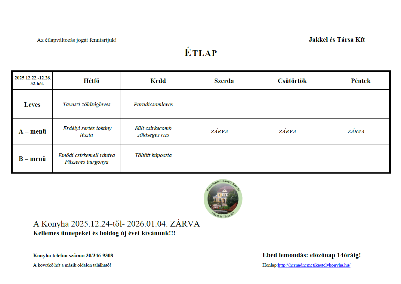 Január 1-től a menü ára: 2.100 Ft! – Leves: 650 Ft; Második: 1.450 Ft